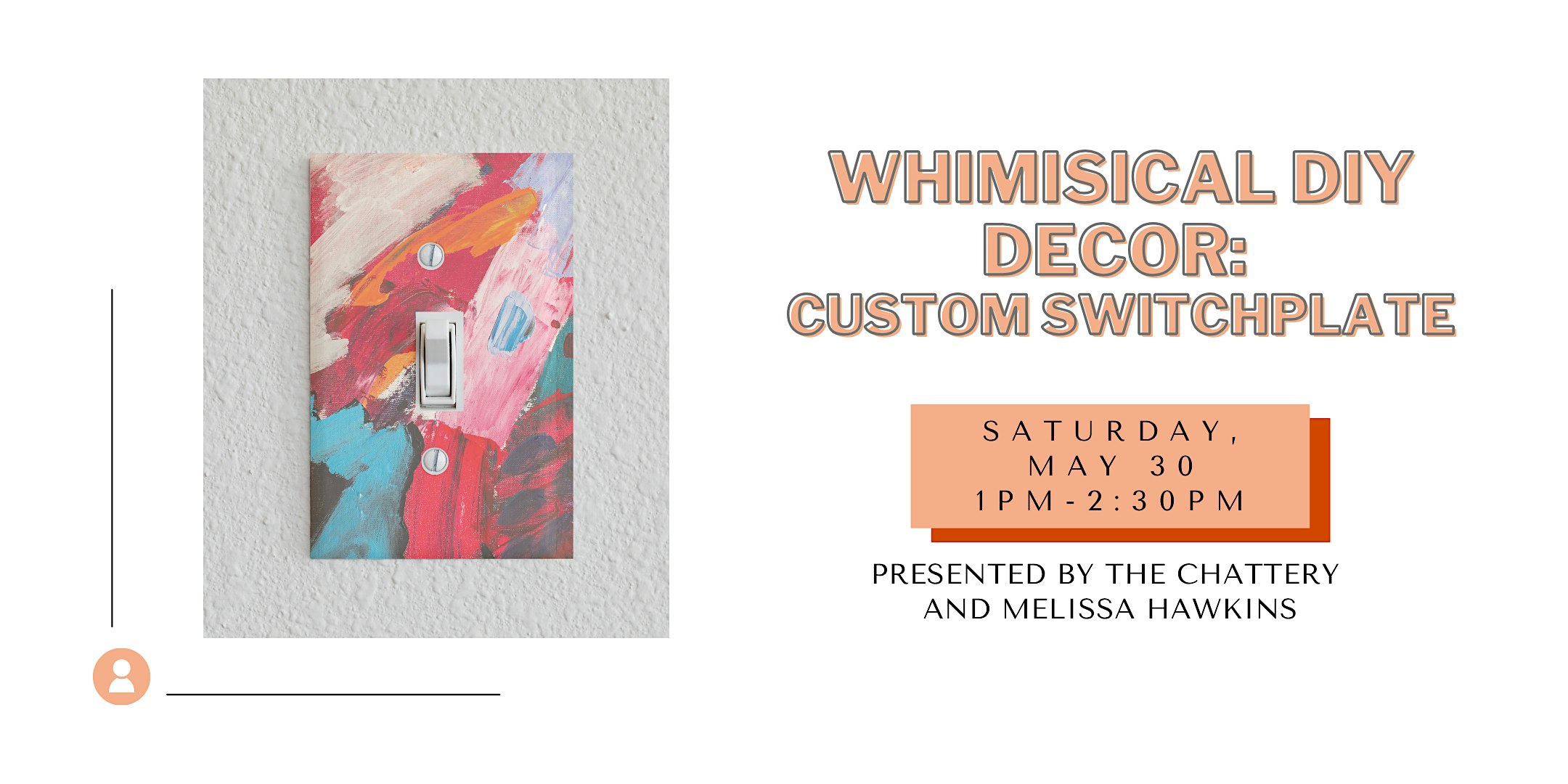 All supplies, including light switch cover plates (standard single, rocker single) or standard electrical cover, paints, brushes, decorative paper, and more. Each participant will be able to customize 5 switchplates, but if you already have a light switch (or electrical outlet) cover you would like to bring, feel free!